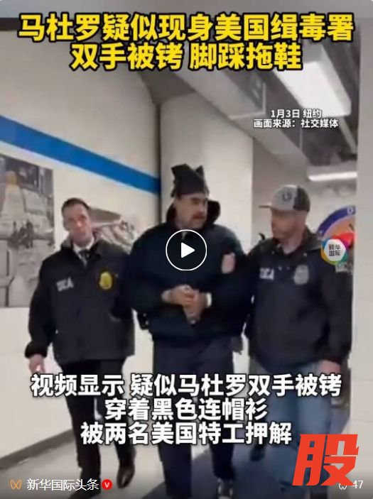 据新华国际头条,当地时间1月3日,美国白宫快速反应小组社交媒体账号RapidResponse47转发了一段视频,记录了疑似委内瑞拉总统马杜罗被押送抵达美国缉毒署(DEA)的视频。