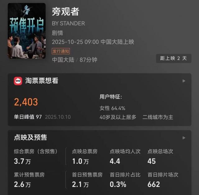 10 月 23 日股涨柜,电影《旁观者》发文宣布撤档:"经慎重考虑,电影《旁观者》将取消原定 10 月 25 日的公映计划,延期上映。我们向所有期待本片的观众、合作伙伴及院线同仁致以诚挚的歉意。"