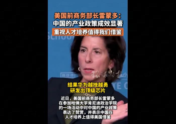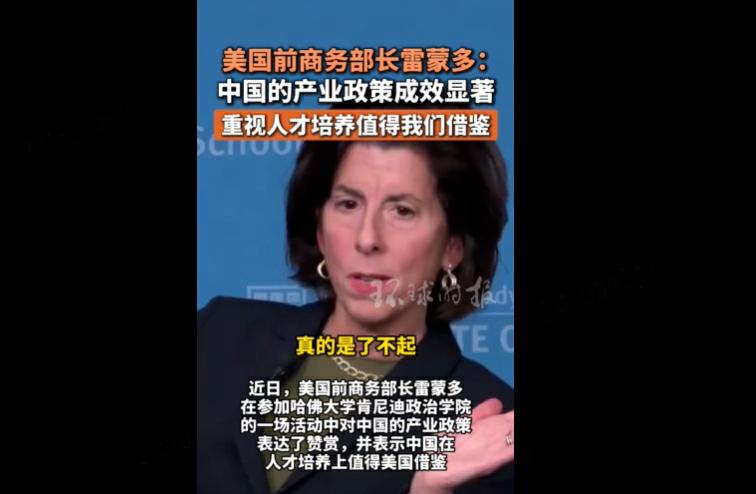 近日,美国前商务部长雷蒙多在参加哈佛大学肯尼迪政治学院的一场活动中对中国的产业政策表达了赞赏,并表示中国在人才培养上值得美国借鉴。